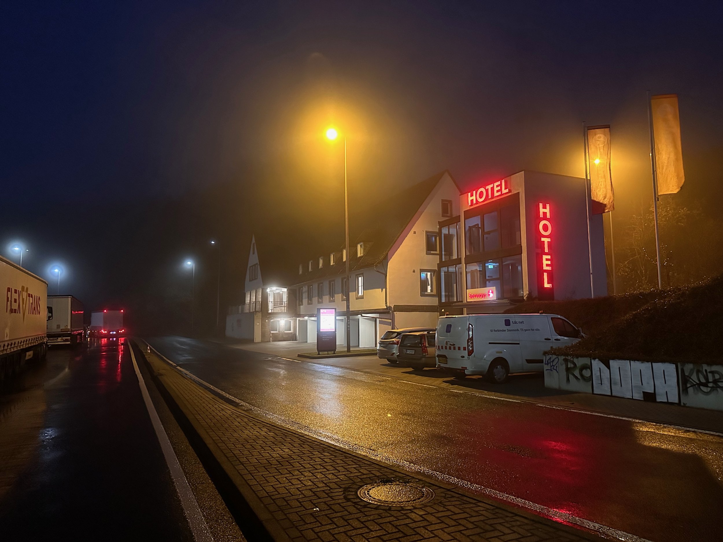 Overnatningen blev booket på booking.com og valget fandt på et motorvejshotel lidt nord for Frankfurt. Turen op til hotellet gik via A9’eren i Frankrig op mod Avignon, hvor vi sprang på A7’eren mod Lyon. Lyon er et trafik knudepunkt, hvor der altid er kø. Også denne lørdag selvom der var fransk helligdag. Køen omkring Lyon var ikke så slem igen og hurtigt gik det videre mod Besançon og Mulhouse via A39 og A36 inden vi ramte Das Vaterland ved Reinen og Freiburg. Turen op gennem Tyskland ad A5’eren mod Franfurt og senere mit pitstop nordøst for Giessen, gik superfint og ingen kø eller vejarbejde.
