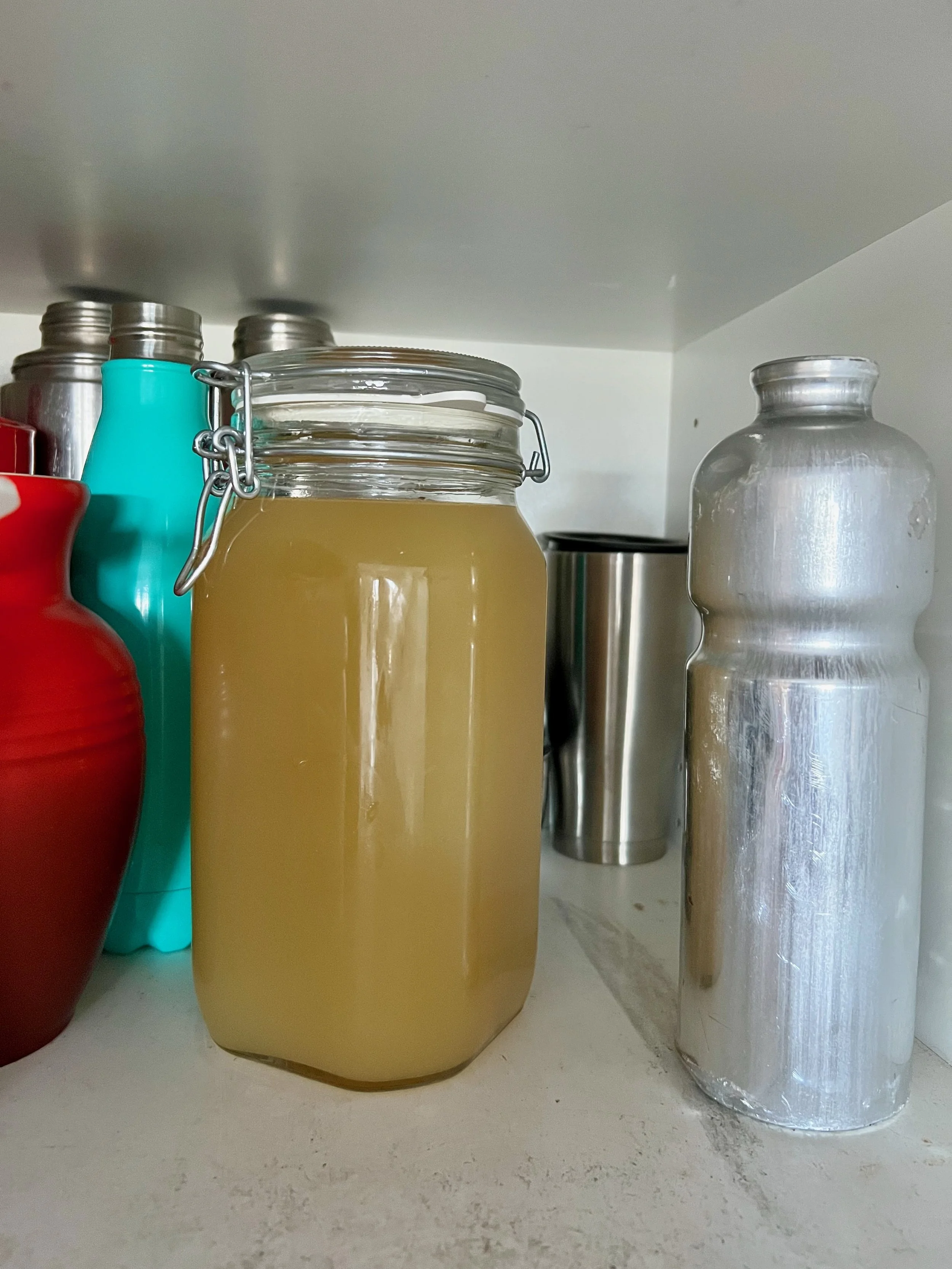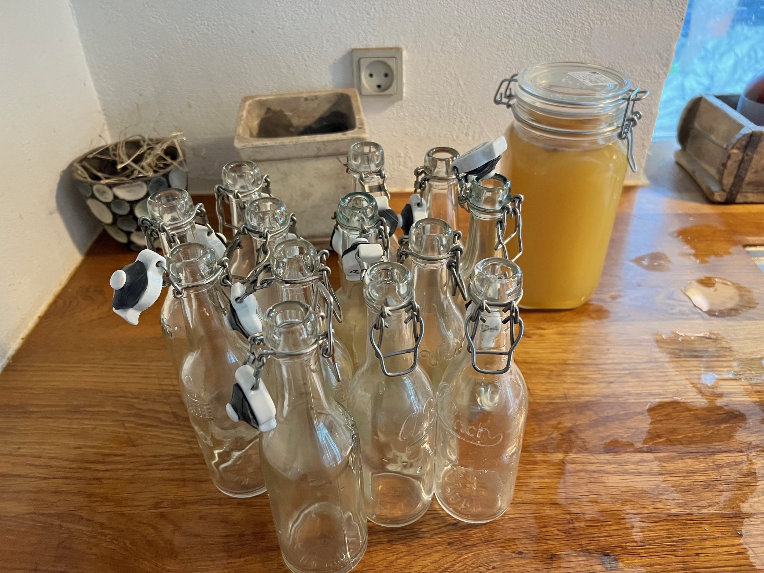 Efter de sidste 40 dages venten er Limoncello'en klar. Der kan godt samles lidt urenheder på toppen, så vi valgte at si drikken gennem et viskestykke. Vi har puttet drikken på nogle gamle patent sodavandsflasker, sådan lidt Danmark møder Italien ...