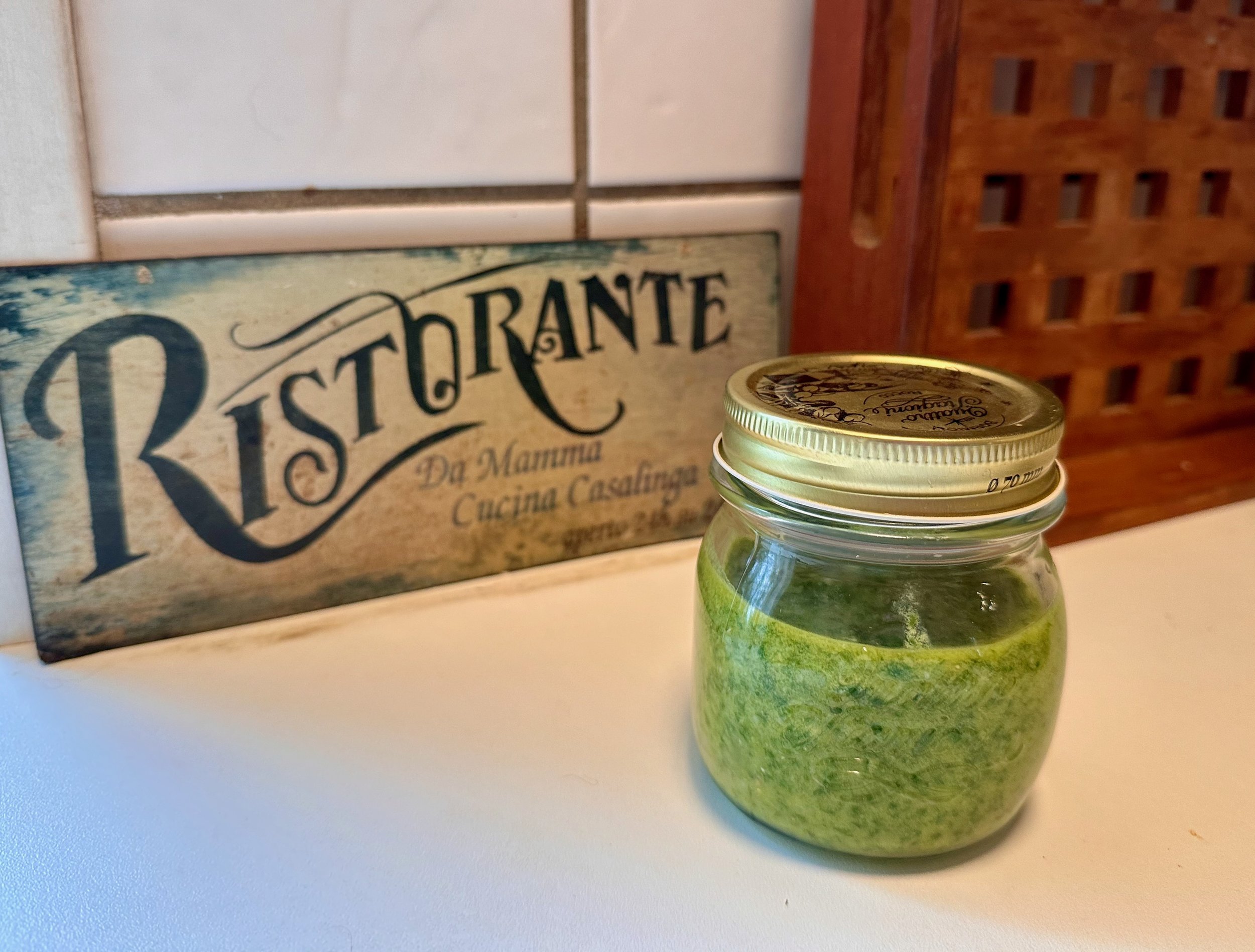 Den grønne guld er et must at have i køleskabet og jeg bruger det på pasta, salat, Carpaccio, i sandwich, ja kun fantasien sætter grænser for anvendelsen ….