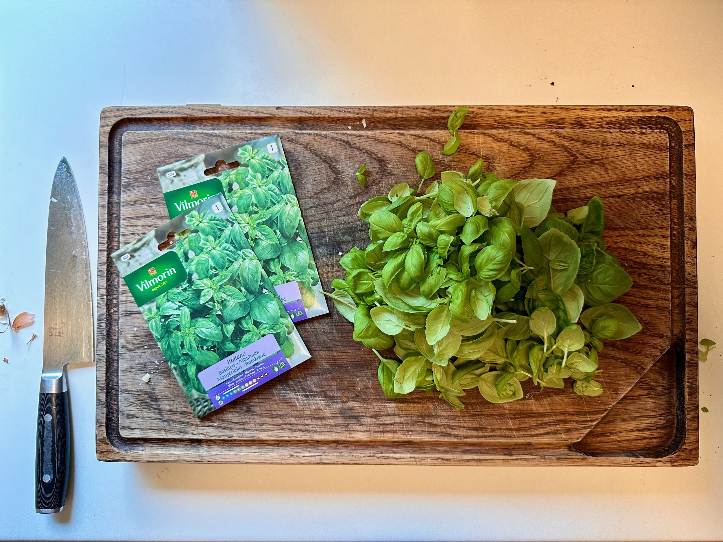 Basilikum-potten plukkes, så det kun er bladene vi bruger. For år tilbage brugte jeg også stilkene, men så bliver pesto’en altså ikke lige så lækker. Det selvfølgelig lidt dyrt at strippe en stort basilikum potte hver gang man skal lave Pesto, så en god idé er jo at dyrke basilikum selv i drivhuset. Og her vil jeg gerne slå et slag for de italienske basilikum frø - de er altså meget bedre end dem man kan købe i DK, så husk at gå på markedet næste gang I er i Italien og tag nogle gode frø med hjem til Danmark.
